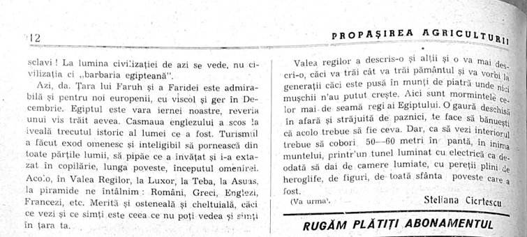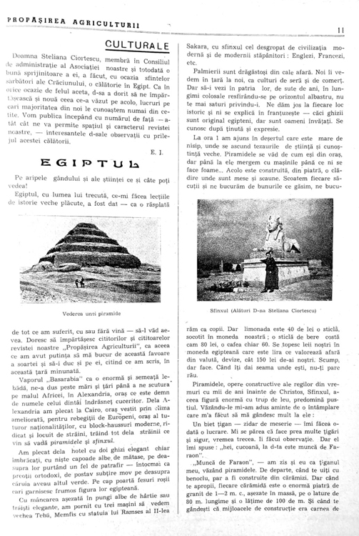 Un articol interesant, cu fotografii personale, a scris Steliana Ciortescu despre călătoria sa în Egipt tot în revista „Propăşirea agriculturii”, An X, nr. 108-109, ianuarie-februarie 1939: