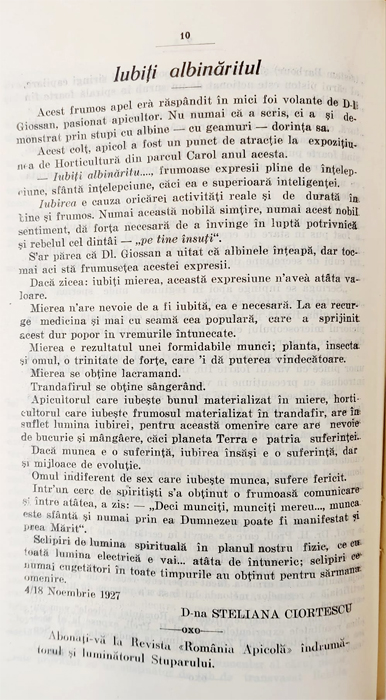 4/18 noiembrie 1927, București. Articolul „Iubiți albinăritul” al Stelianei Ciortescu